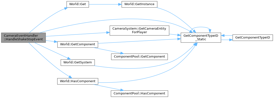 References World::Get(), CameraSystem::GetCameraEntityForPlayer(), World::GetComponent(), GetComponentTypeID_Static(), World::GetSystem(), World::HasComponent(), INVALID_ENTITY_ID, and CameraEffects_data::isShaking.