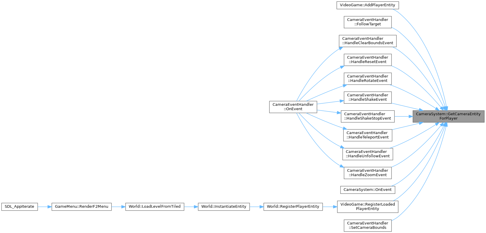 Referenced by VideoGame::AddPlayerEntity(), CameraEventHandler::FollowTarget(), CameraEventHandler::HandleClearBoundsEvent(), CameraEventHandler::HandleResetEvent(), CameraEventHandler::HandleRotateEvent(), CameraEventHandler::HandleShakeEvent(), CameraEventHandler::HandleShakeStopEvent(), CameraEventHandler::HandleTeleportEvent(), CameraEventHandler::HandleUnfollowEvent(), CameraEventHandler::HandleZoomEvent(), OnEvent(), VideoGame::RegisterLoadedPlayerEntity(), and CameraEventHandler::SetCameraBounds().