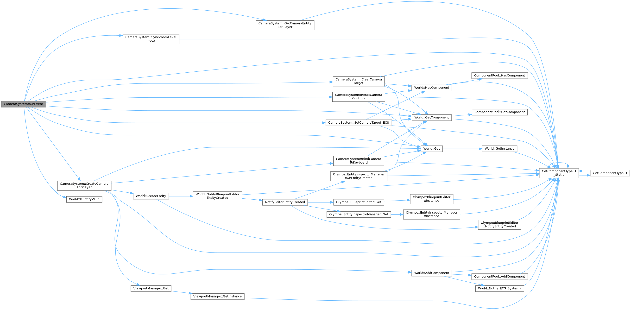 References CameraType_2_5D, CameraType_2D, CameraType_Isometric, ClearCameraTarget(), CreateCameraForPlayer(), World::Get(), GetCameraEntityForPlayer(), World::GetComponent(), GetComponentTypeID_Static(), INVALID_ENTITY_ID, World::IsEntityValid(), CameraEffects_data::isShaking, Olympe_EventType_Camera_Mode_2_5D, Olympe_EventType_Camera_Mode_2D, Olympe_EventType_Camera_Mode_Isometric, Olympe_EventType_Camera_MoveToPosition, Olympe_EventType_Camera_Reset, Olympe_EventType_Camera_RotateTo, Olympe_EventType_Camera_Shake, Olympe_EventType_Camera_Target_Follow, Olympe_EventType_Camera_Target_Unfollow, Olympe_EventType_Camera_Teleport, Olympe_EventType_Camera_ZoomTo, Camera_data::position, ResetCameraControls(), SetCameraTarget_ECS(), SyncZoomLevelIndex(), SYSTEM_LOG, and Vector::x.