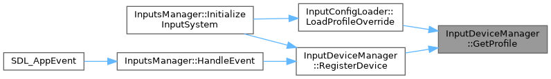 Here is the call graph for this function:| std::shared_ptr< InputProfile > InputDeviceManager::GetProfile | ( | const std::string & | profileName | ) |