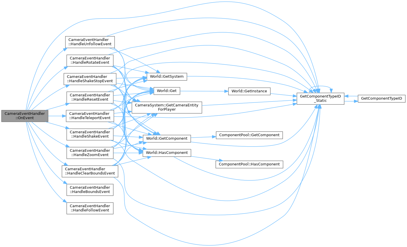 References GetComponentTypeID_Static(), HandleBoundsEvent(), HandleClearBoundsEvent(), HandleFollowEvent(), HandleResetEvent(), HandleRotateEvent(), HandleShakeEvent(), HandleShakeStopEvent(), HandleTeleportEvent(), HandleUnfollowEvent(), HandleZoomEvent(), Olympe_EventType_Camera_ClearBounds, Olympe_EventType_Camera_Reset, Olympe_EventType_Camera_RotateTo, Olympe_EventType_Camera_SetBounds, Olympe_EventType_Camera_Shake, Olympe_EventType_Camera_Shake_Stop, Olympe_EventType_Camera_Target_Follow, Olympe_EventType_Camera_Target_Unfollow, Olympe_EventType_Camera_Teleport, and Olympe_EventType_Camera_ZoomTo.