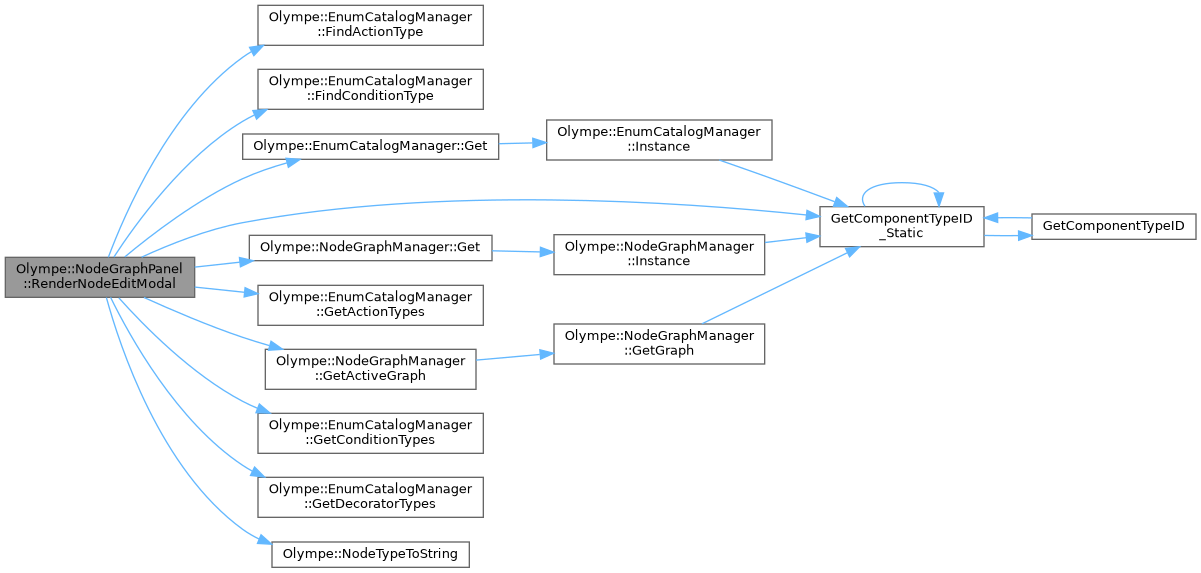 References Olympe::BT_Action, Olympe::BT_Condition, Olympe::BT_Decorator, Olympe::EnumCatalogManager::FindActionType(), Olympe::EnumCatalogManager::FindConditionType(), Olympe::EnumCatalogManager::Get(), Olympe::NodeGraphManager::Get(), Olympe::EnumCatalogManager::GetActionTypes(), Olympe::NodeGraphManager::GetActiveGraph(), GetComponentTypeID_Static(), Olympe::EnumCatalogManager::GetConditionTypes(), Olympe::EnumCatalogManager::GetDecoratorTypes(), m_EditingNodeId, m_NodeNameBuffer, m_ShowNodeEditModal, Olympe::NodeTypeToString(), and Olympe::CatalogType::parameters.